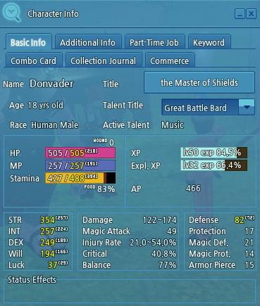 To begin, it has been a long while since I posted on MabiBeats, granted it had been a long while since I had played Mabinogi itself. However, I am glad to be getting back into the groove of things with a fervor. I apologies to MabiBeats and its' creators for being a unproductive user, which I hope to rectify. It was hard to think of something to Post considering I'm not the most educated on how to socialize on the Internet, or compose music by means of MML or related Material... But, now I'm trying to not let that discourage me. So to my question... What do you guys think is important to rank up and skills to acquire as a player on Mabinogi to really hold their own in even the hardest of Challenges? For me, I am a Master Warrior, Great Bard and Great Apothcary post Cumulative level 100 (H) but still feel weak. I have many skills R1 or nearly r1 but when I enter places like Peaca, or even Hard Shadow Missions, I have to run out, if I can, in order to not die. It's not like I don't have decent equipment that are useless, but I feel uncomfortable buying things for a online game, cause I've spend hundreds like that before... I don't like Magic because that's never been my thing plus....SPOOPY so no... magic even if it is op and makes you insta-powerful in this game These are my stats with no weapons equiped with RK Gaunlets and RK Boots I look forward to your replies, I'm genuinely curious and would let your input guys.